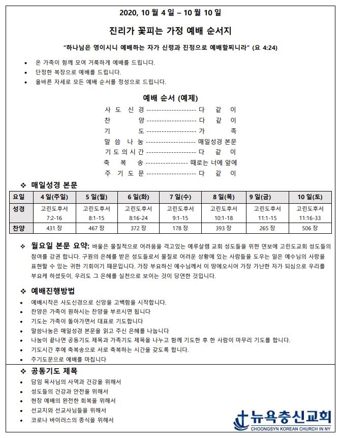 10월 4일 주간 진리가 꽃피는 가정 예배지 Oct 3, 2020 0 Comment Post By:CSKC Share: Prev Next You Might Also Like 18 Oct 2025 0 10월 19일 주일예배 주보 11 Oct 2025 0 10월 12일 주일예배 주보 5 Oct 2025 0 한마음 10월 기도제목 Leave Comment Your email address will not be published.