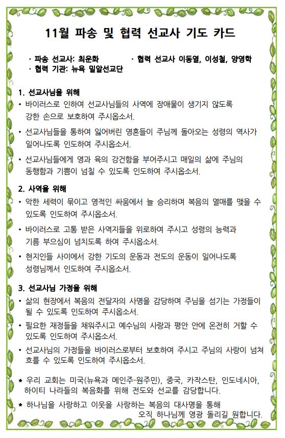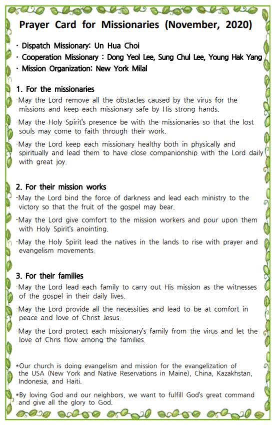 11월 파송 및 협력 선교사 기도 카드 Oct 31, 2020 0 Comment Post By:CSKC Share: Prev Next You Might Also Like 18 Oct 2025 0 10월 19일 주일예배 주보 11 Oct 2025 0 10월 12일 주일예배 주보 5 Oct 2025 0 한마음 10월 기도제목 Leave Comment Your email address will not be published.