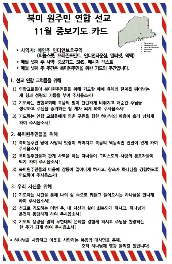 11월 북미 원주민 연합 중보기도 카드 Nov 14, 2020 0 Comment Post By:CSKC Share: Prev Next You Might Also Like 18 Oct 2025 0 10월 19일 주일예배 주보 11 Oct 2025 0 10월 12일 주일예배 주보 5 Oct 2025 0 한마음 10월 기도제목 Leave Comment Your email address will not be published.