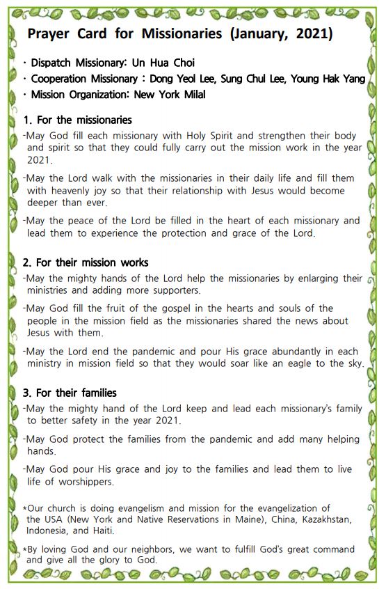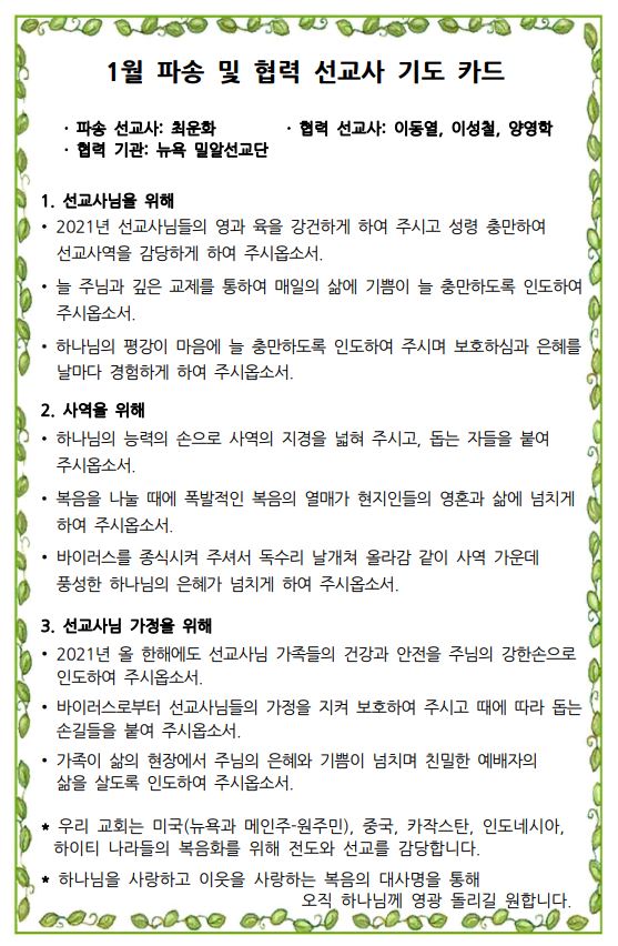 1월 파송 및 협력 선교사 기도 카드 Jan 2, 2021 0 Comment Post By:CSKC Share: Prev Next You Might Also Like 25 Oct 2025 0 10월 26일 주일예배 주보 18 Oct 2025 0 10월 19일 주일예배 주보 11 Oct 2025 0 10월 12일 주일예배 주보 Leave Comment Your email address will not be published.