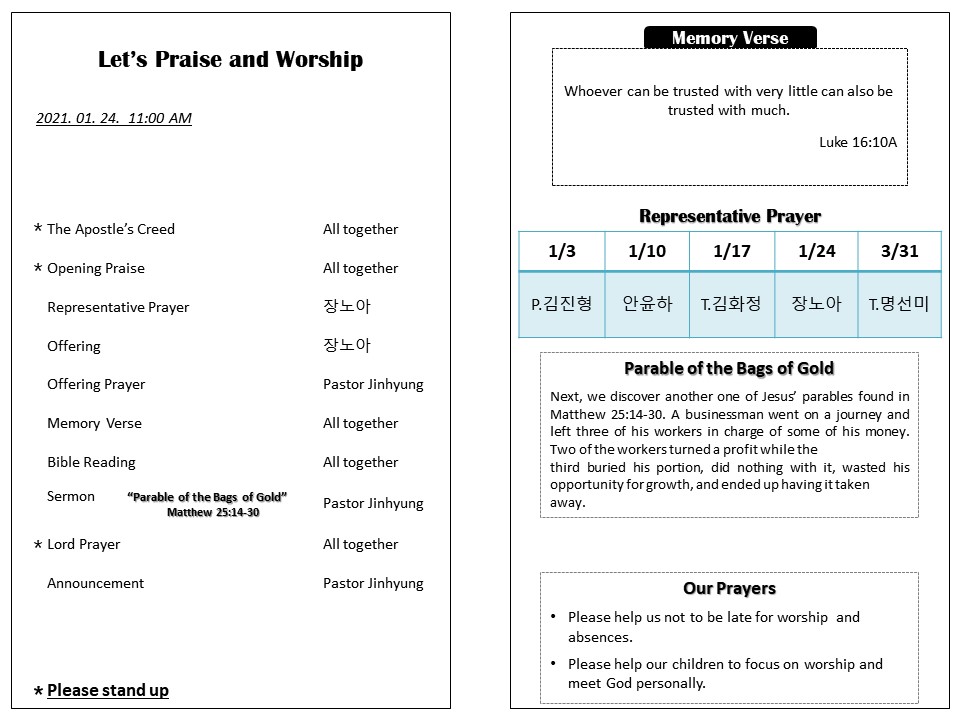 1월 24일 주일학교 예배 Jan 23, 2021 0 Comment Post By:CSKC 중고등부 오전 11시 ZOOM Meeting 으로 진행됩니다. 아래 링크를 클릭 해주세요. https://us02web.zoom.us/j/8421112000 Passcode (미팅 패스코드): 1111 유초등부 오전 10시 50분, 유초등부 예배가 Zoom으로 드려집니다. 아래 링크를 클릭 해주세요. https://us02web.zoom.us/j/82980090689 회의 ID: 829 8009 0689 암호: 15311 유치부 Share: Prev Next You Might Also Like 25 Oct 2025 0 10월 26일 주일예배 주보 18 Oct 2025 0 10월 19일 주일예배 주보 11 Oct 2025 0 10월 12일 주일예배 주보 Leave Comment Your email address will not be published.