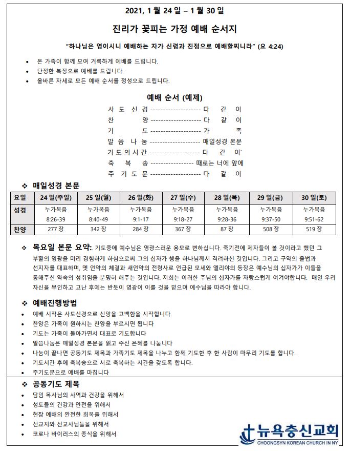 뉴욕충신교회 > 주보 > 1월 4주차 가정 예배지