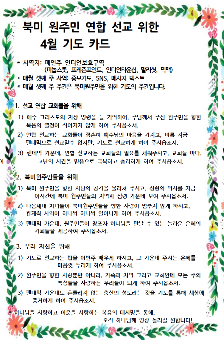 4월 북미원주민 연합선교 중보카드 Apr 16, 2021 0 Comment Post By:CSKC Share: Prev Next You Might Also Like 25 Oct 2025 0 10월 26일 주일예배 주보 18 Oct 2025 0 10월 19일 주일예배 주보 11 Oct 2025 0 10월 12일 주일예배 주보 Leave Comment Your email address will not be published.