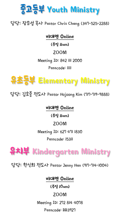 12월 26일 주일학교 예배 Dec 26, 2021 0 Comment Post By:CSKC 중고등부 주일예배 ZOOM Link: https://us02web.zoom.us/j/8421112000 유초등부 주일예배 ZOOM Link: https://us02web.zoom.us/j/6274711830 유치부 주일예배 ZOOM Link: https://us02web.zoom.us/j/2728144078?pwd=K2xLZ0VpNzNhVVBJUlRoSjROcUNpZz09 Share: Prev Next You Might Also Like 18 Oct 2025 0 10월 19일 주일예배 주보 11 Oct 2025 0 10월 12일 주일예배 주보 5 Oct 2025 0 한마음 10월 기도제목