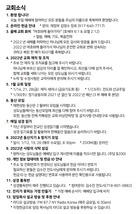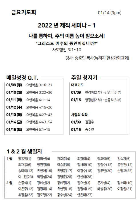 1월 9일 주일예배 주보 Jan 8, 2022 0 Comment Post By:CSKC Share: Prev Next You Might Also Like 18 Oct 2025 0 10월 19일 주일예배 주보 11 Oct 2025 0 10월 12일 주일예배 주보 5 Oct 2025 0 한마음 10월 기도제목