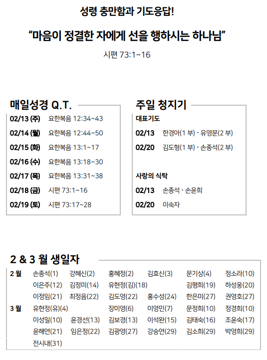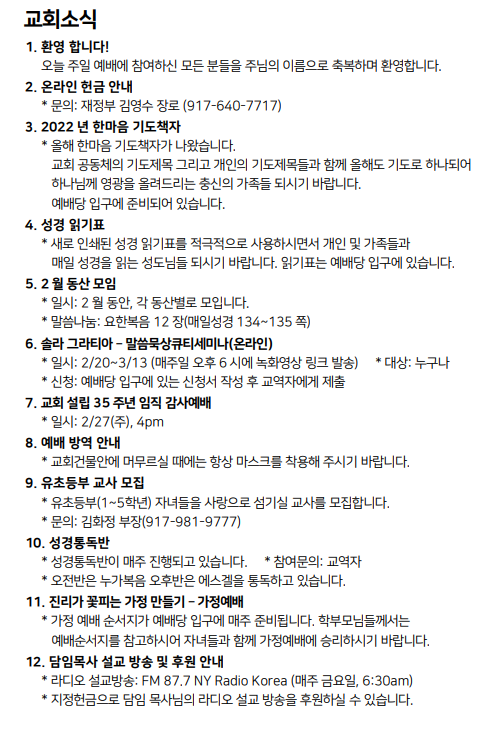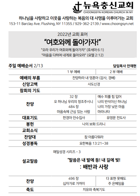 2월 13일 주일예배 주보 Feb 12, 2022 0 Comment Post By:CSKC Share: Prev Next You Might Also Like 18 Oct 2025 0 10월 19일 주일예배 주보 11 Oct 2025 0 10월 12일 주일예배 주보 5 Oct 2025 0 한마음 10월 기도제목