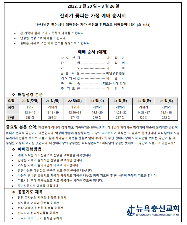 3월 3주차 가정예배지 Mar 25, 2022 0 Comment Post By:CSKC Share: Prev Next You Might Also Like 18 Oct 2025 0 10월 19일 주일예배 주보 11 Oct 2025 0 10월 12일 주일예배 주보 5 Oct 2025 0 한마음 10월 기도제목