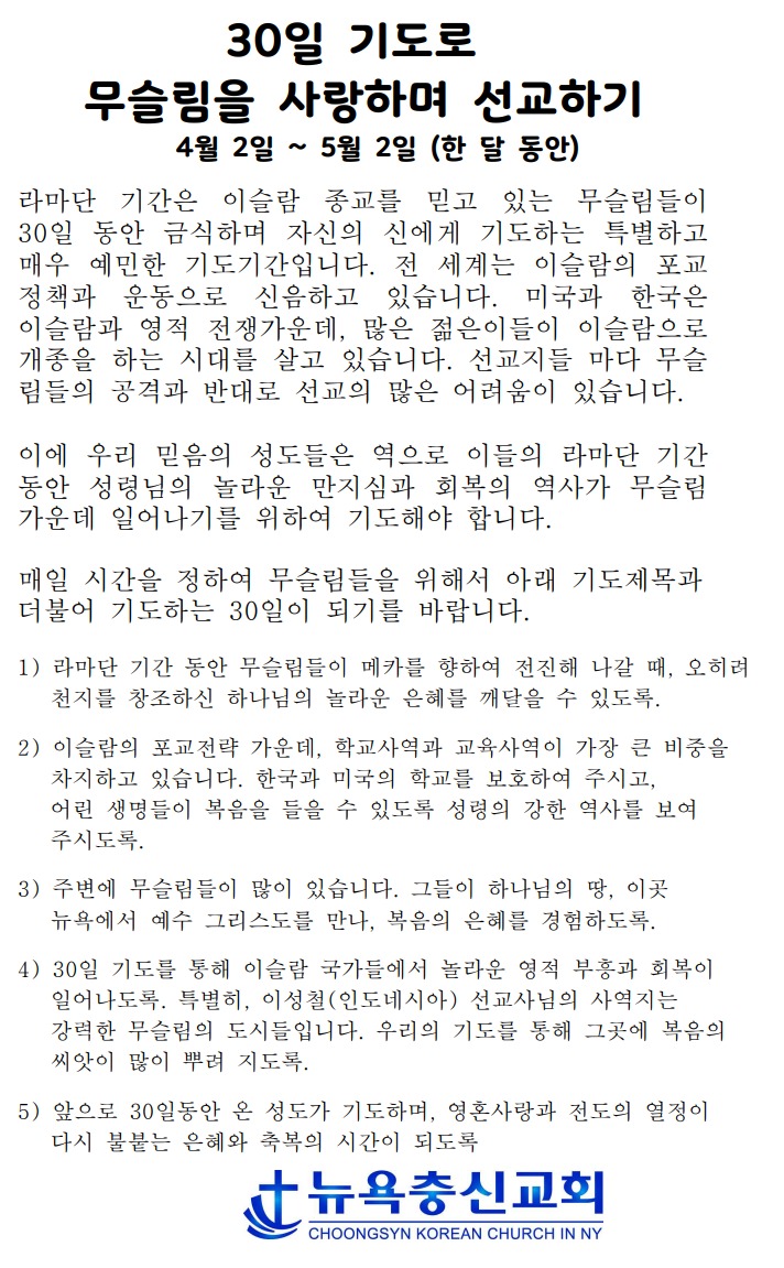 30일 동안 무슬림 사랑하기 Mar 26, 2022 0 Comment Post By:CSKC Share: Prev Next You Might Also Like 18 Oct 2025 0 10월 19일 주일예배 주보 11 Oct 2025 0 10월 12일 주일예배 주보 5 Oct 2025 0 한마음 10월 기도제목
