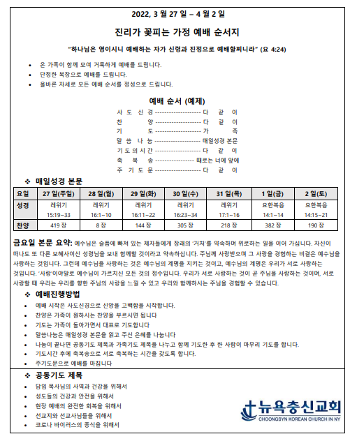 3월 4주차 가정예배지 Mar 26, 2022 0 Comment Post By:CSKC Share: Prev Next You Might Also Like 18 Oct 2025 0 10월 19일 주일예배 주보 11 Oct 2025 0 10월 12일 주일예배 주보 5 Oct 2025 0 한마음 10월 기도제목