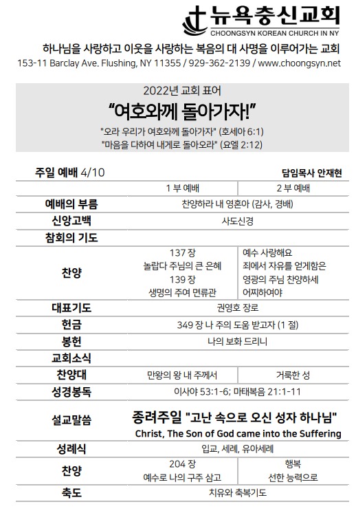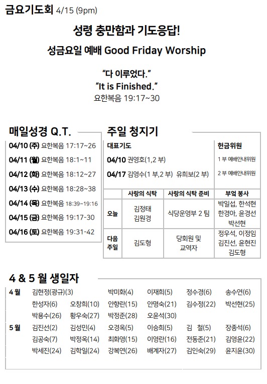 4월 10일 주일예배 주보 Apr 9, 2022 0 Comment Post By:CSKC Share: Prev Next You Might Also Like 18 Oct 2025 0 10월 19일 주일예배 주보 11 Oct 2025 0 10월 12일 주일예배 주보 5 Oct 2025 0 한마음 10월 기도제목