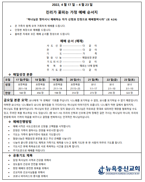 4월 3주차 가정예배지 Apr 16, 2022 0 Comment Post By:CSKC Share: Prev Next You Might Also Like 18 Oct 2025 0 10월 19일 주일예배 주보 11 Oct 2025 0 10월 12일 주일예배 주보 5 Oct 2025 0 한마음 10월 기도제목