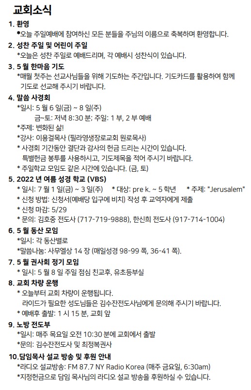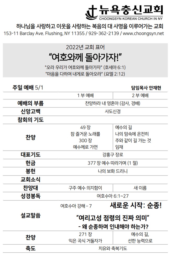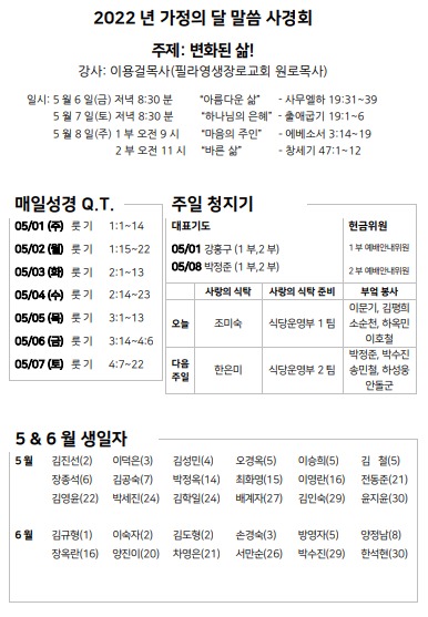 5월 1일 주일예배 주보 Apr 30, 2022 0 Comment Post By:CSKC Share: Prev Next You Might Also Like 18 Oct 2025 0 10월 19일 주일예배 주보 11 Oct 2025 0 10월 12일 주일예배 주보 5 Oct 2025 0 한마음 10월 기도제목