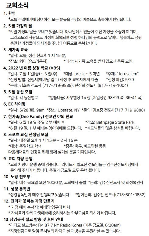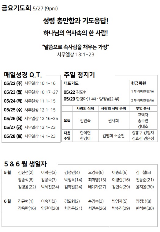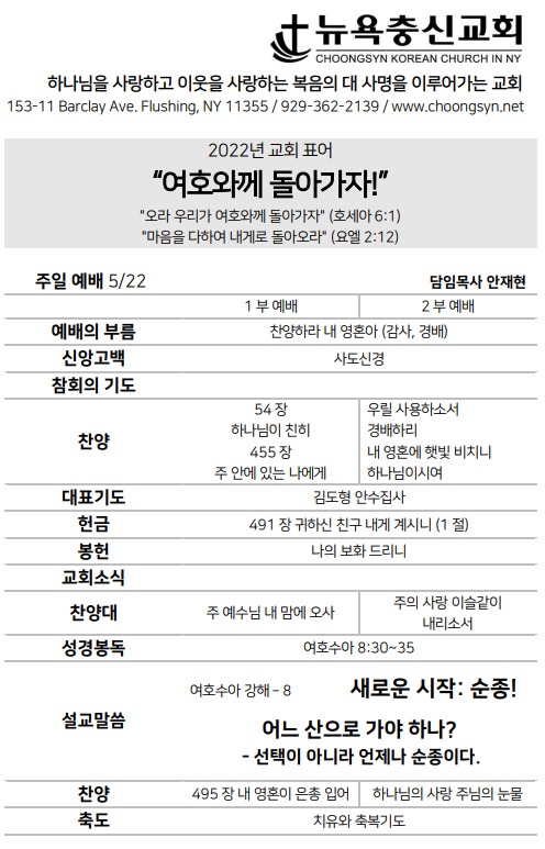 5월 22일 주일예배 주보 May 21, 2022 0 Comment Post By:CSKC Share: Prev Next You Might Also Like 18 Oct 2025 0 10월 19일 주일예배 주보 11 Oct 2025 0 10월 12일 주일예배 주보 5 Oct 2025 0 한마음 10월 기도제목