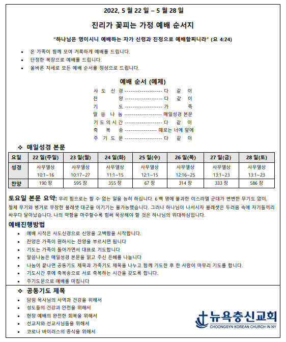 5월 4주차 가정예배지 May 22, 2022 0 Comment Post By:CSKC Share: Prev Next You Might Also Like 18 Oct 2025 0 10월 19일 주일예배 주보 11 Oct 2025 0 10월 12일 주일예배 주보 5 Oct 2025 0 한마음 10월 기도제목