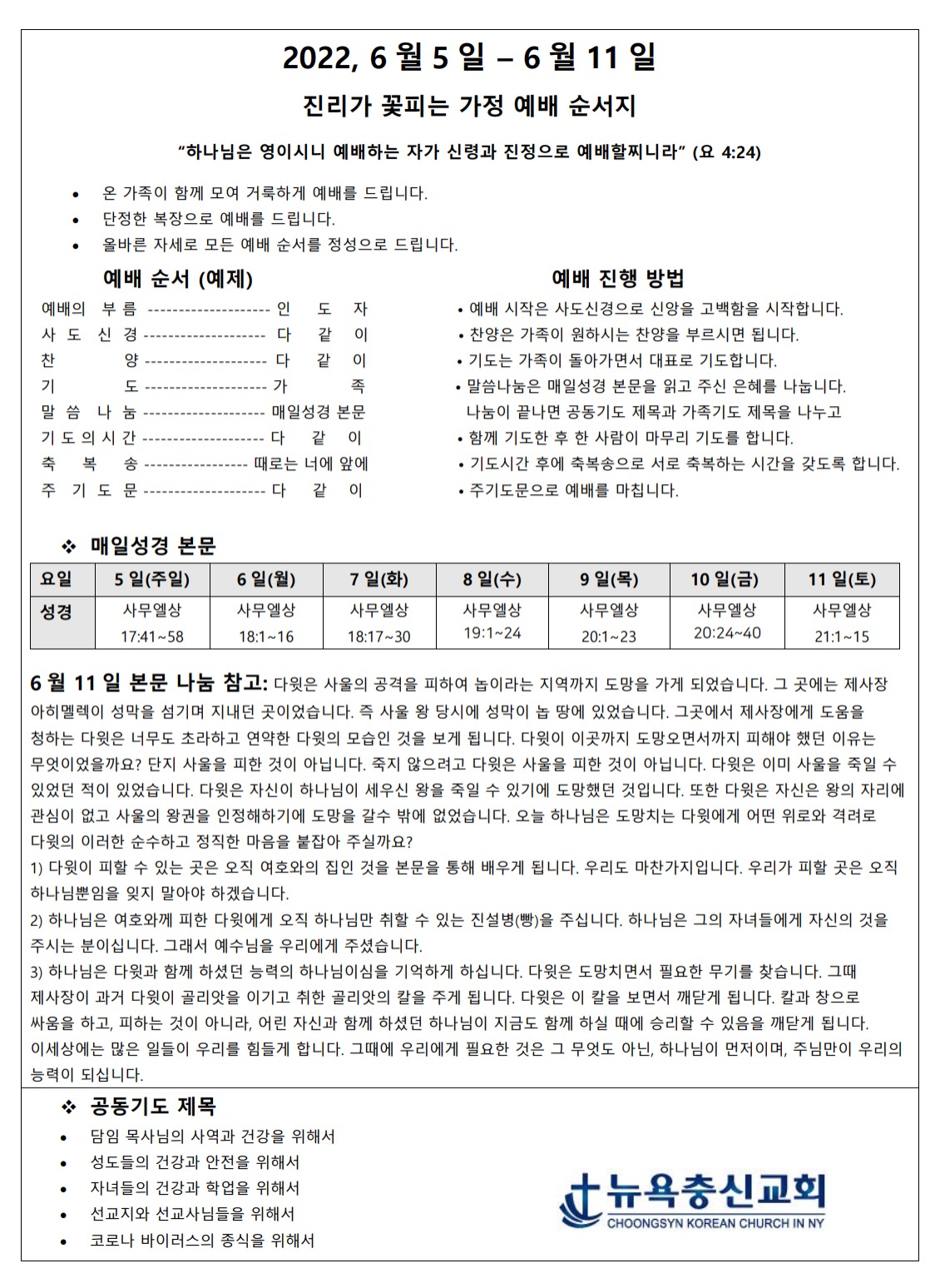 6월 1주차 가정예배지 Jun 4, 2022 0 Comment Post By:CSKC Share: Prev Next You Might Also Like 18 Oct 2025 0 10월 19일 주일예배 주보 11 Oct 2025 0 10월 12일 주일예배 주보 5 Oct 2025 0 한마음 10월 기도제목