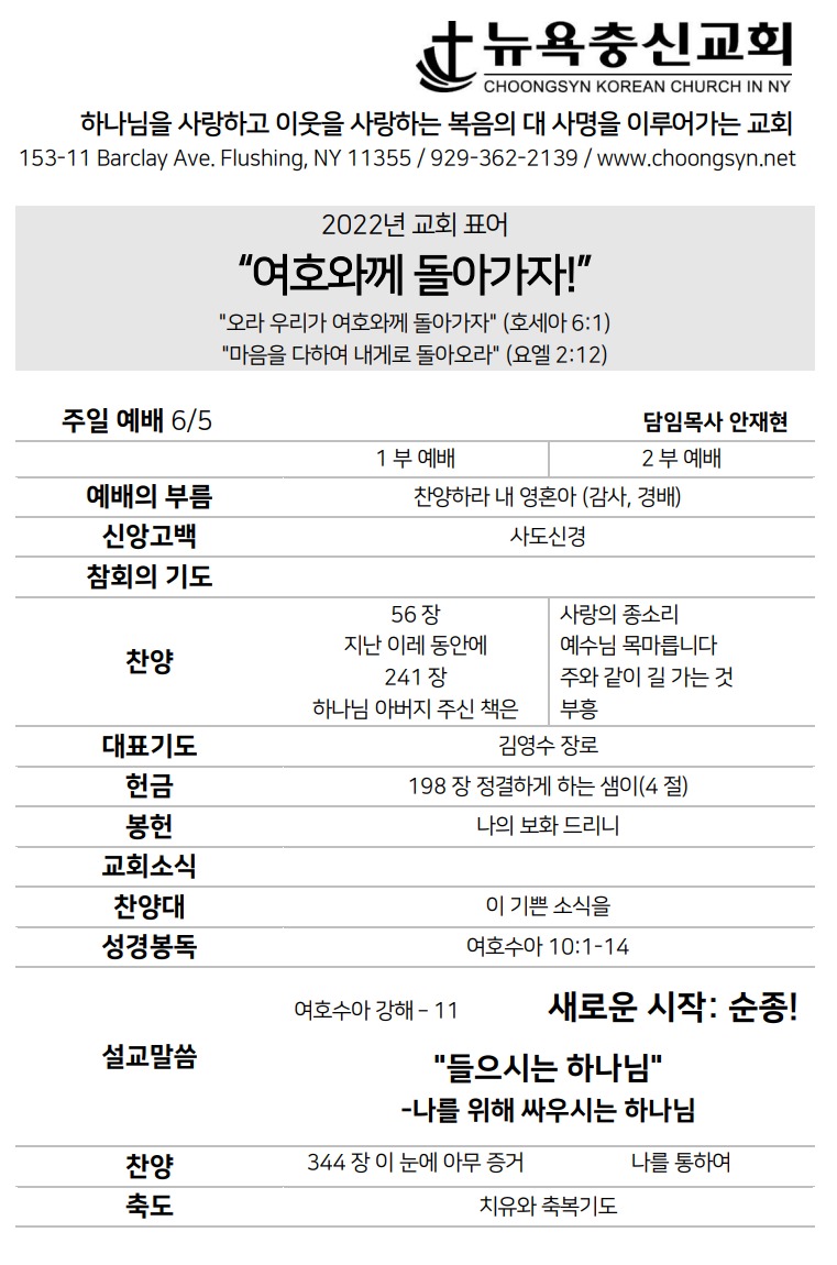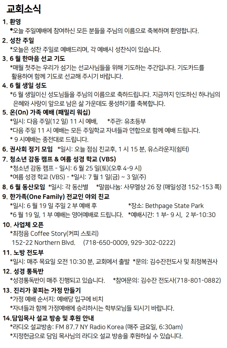 6월 5일 주일예배 주보 Jun 4, 2022 0 Comment Post By:CSKC Share: Prev Next You Might Also Like 18 Oct 2025 0 10월 19일 주일예배 주보 11 Oct 2025 0 10월 12일 주일예배 주보 5 Oct 2025 0 한마음 10월 기도제목