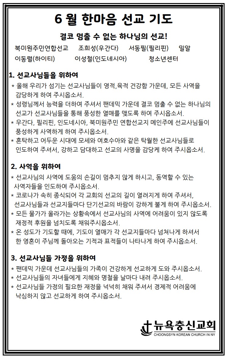 6월 한마음 선교 기도제목 Jun 5, 2022 0 Comment Post By:CSKC Share: Prev Next You Might Also Like 18 Oct 2025 0 10월 19일 주일예배 주보 11 Oct 2025 0 10월 12일 주일예배 주보 5 Oct 2025 0 한마음 10월 기도제목