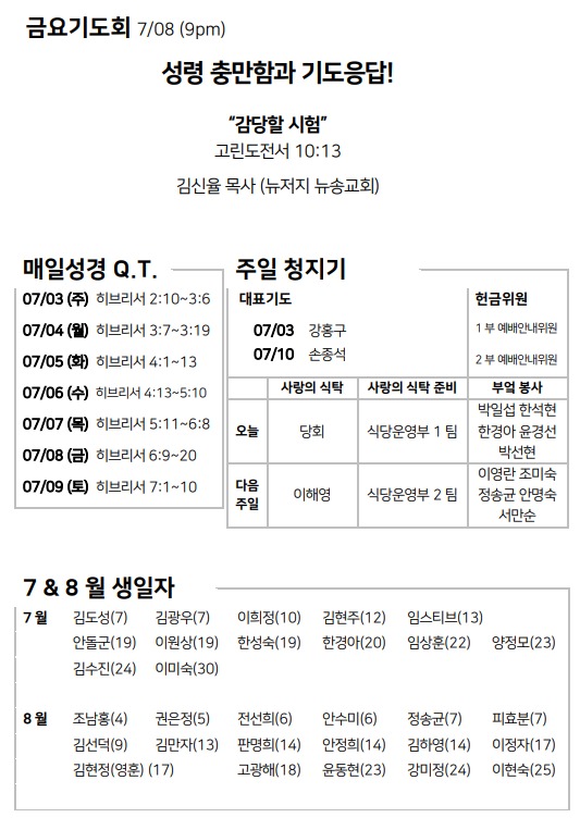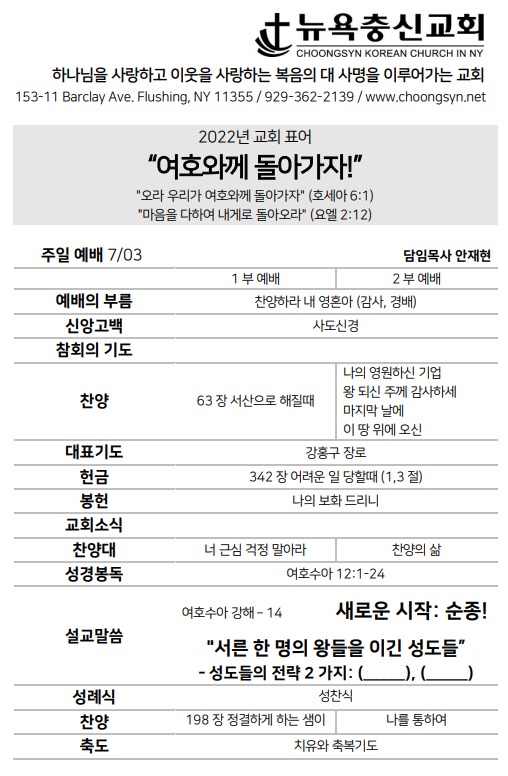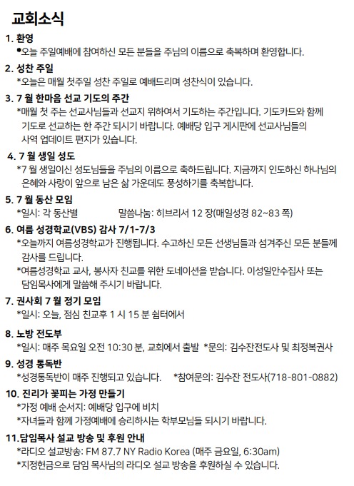 7월 03일 주일예배 주보 Jul 3, 2022 0 Comment Post By:CSKC Share: Prev Next You Might Also Like 18 Oct 2025 0 10월 19일 주일예배 주보 11 Oct 2025 0 10월 12일 주일예배 주보 5 Oct 2025 0 한마음 10월 기도제목