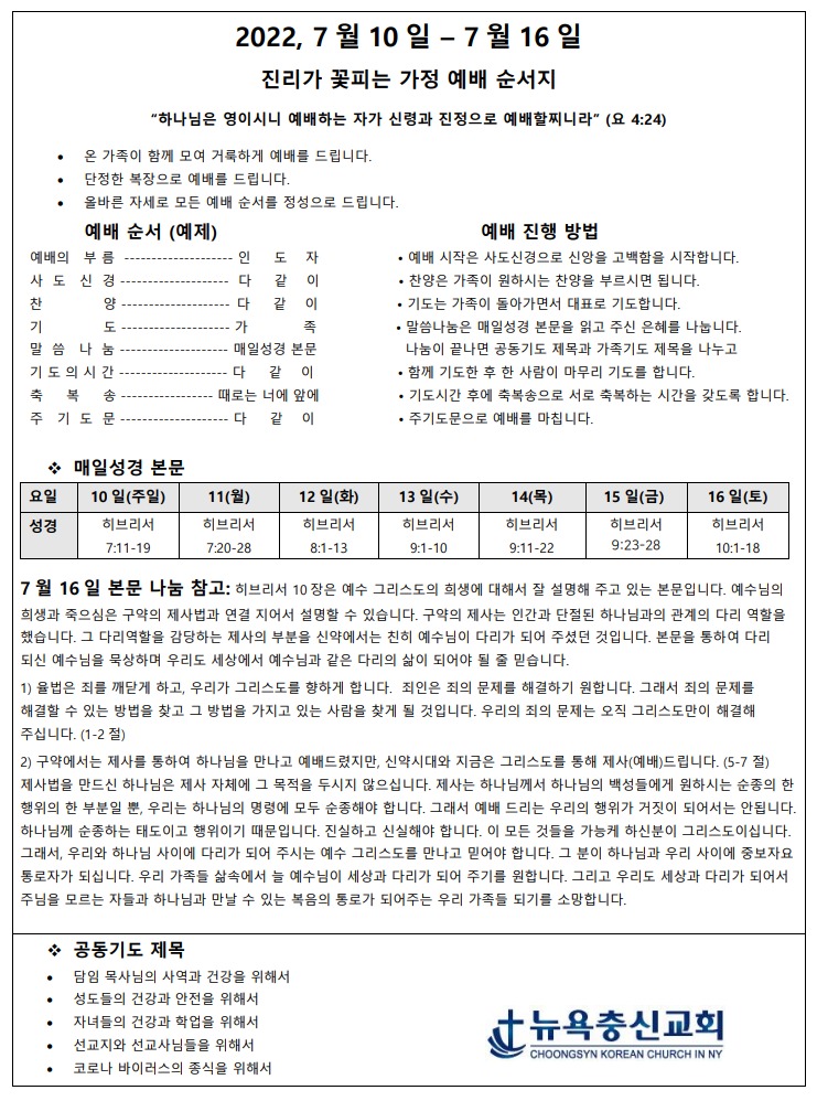 7월 2주차 가정예배지 Jul 9, 2022 0 Comment Post By:CSKC Share: Prev Next You Might Also Like 18 Oct 2025 0 10월 19일 주일예배 주보 11 Oct 2025 0 10월 12일 주일예배 주보 5 Oct 2025 0 한마음 10월 기도제목