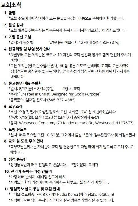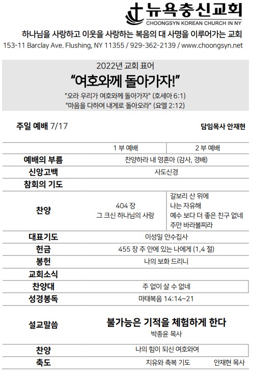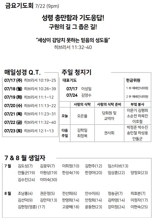 7월 17일 주일예배 주보 Jul 16, 2022 0 Comment Post By:CSKC Share: Prev Next You Might Also Like 18 Oct 2025 0 10월 19일 주일예배 주보 11 Oct 2025 0 10월 12일 주일예배 주보 5 Oct 2025 0 한마음 10월 기도제목