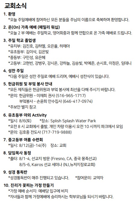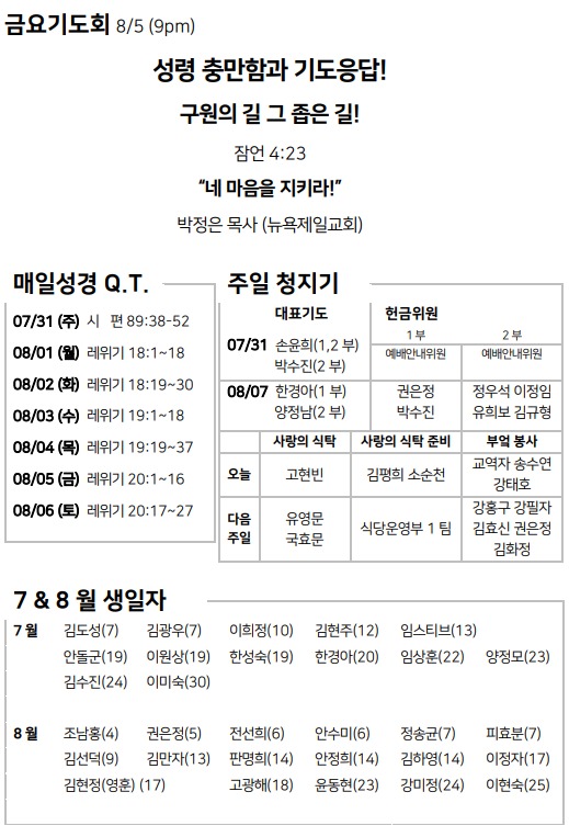 7월 31일 주일예배 주보 Jul 30, 2022 0 Comment Post By:CSKC Share: Prev Next You Might Also Like 18 Oct 2025 0 10월 19일 주일예배 주보 11 Oct 2025 0 10월 12일 주일예배 주보 5 Oct 2025 0 한마음 10월 기도제목