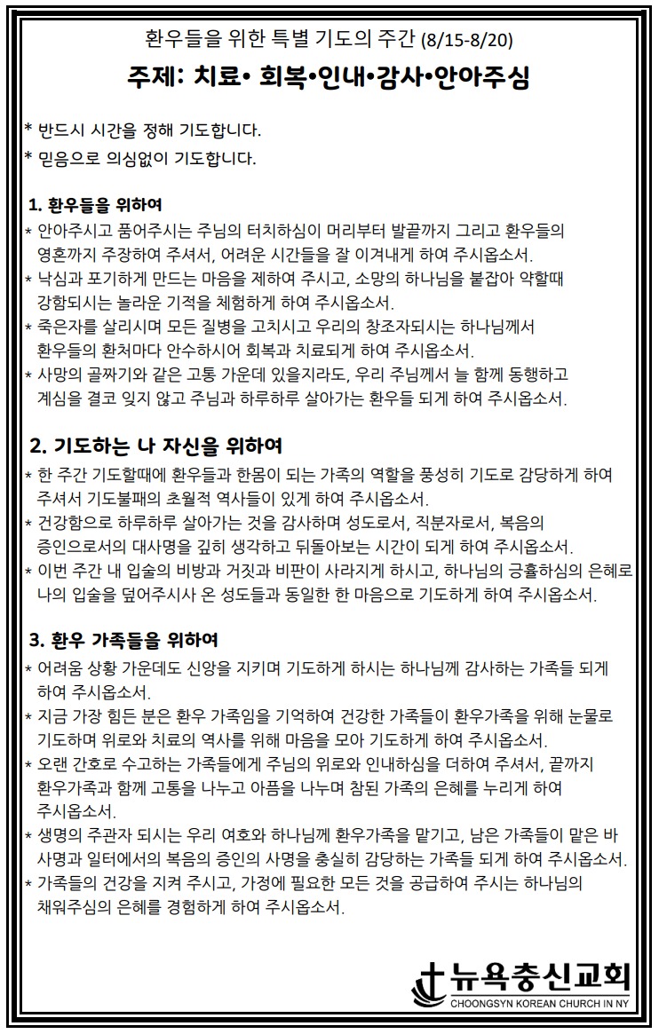 환우들을 위한 특별 기도 Aug 14, 2022 0 Comment Post By:CSKC Share: Prev Next You Might Also Like 18 Oct 2025 0 10월 19일 주일예배 주보 11 Oct 2025 0 10월 12일 주일예배 주보 5 Oct 2025 0 한마음 10월 기도제목