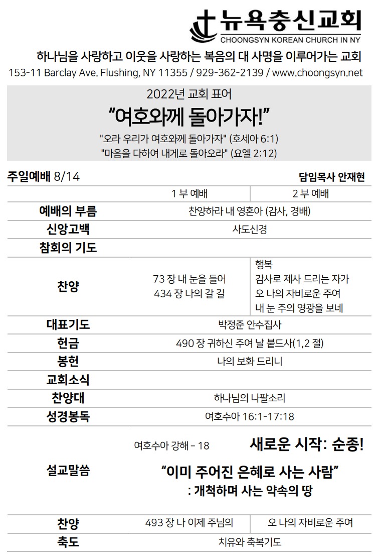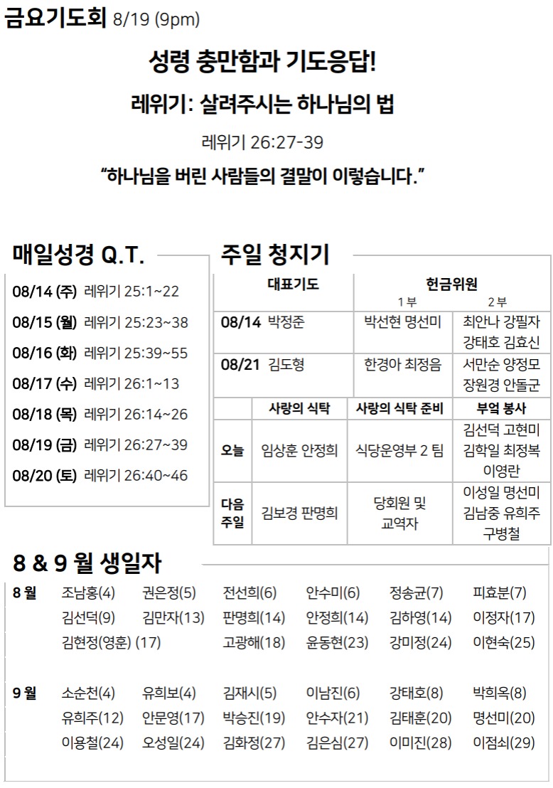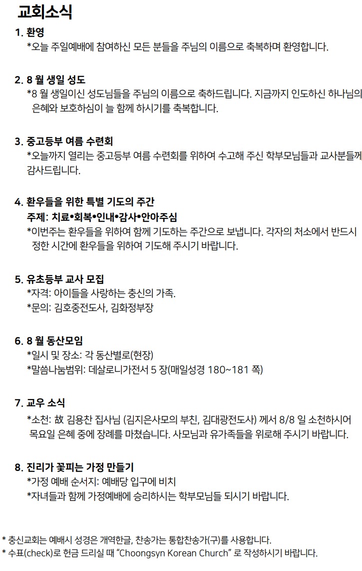 8월 14일 주일예배 주보 Aug 14, 2022 0 Comment Post By:CSKC Share: Prev Next You Might Also Like 18 Oct 2025 0 10월 19일 주일예배 주보 11 Oct 2025 0 10월 12일 주일예배 주보 5 Oct 2025 0 한마음 10월 기도제목