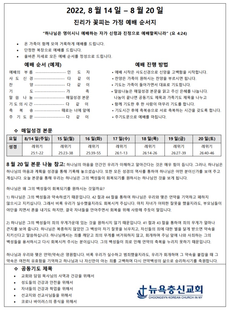 8월 2주차 가정예배지 Aug 14, 2022 0 Comment Post By:CSKC Share: Prev Next You Might Also Like 18 Oct 2025 0 10월 19일 주일예배 주보 11 Oct 2025 0 10월 12일 주일예배 주보 5 Oct 2025 0 한마음 10월 기도제목