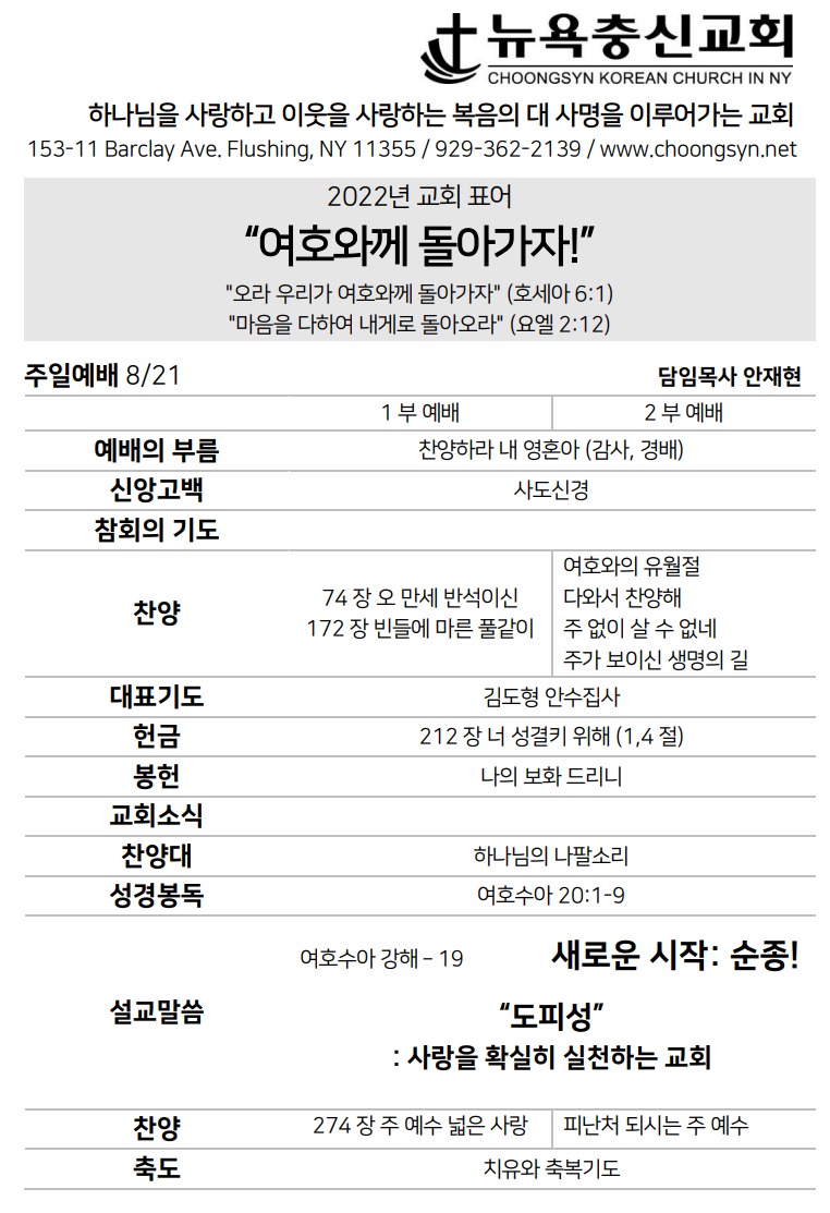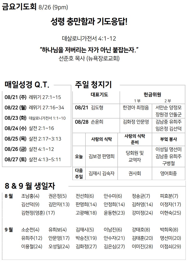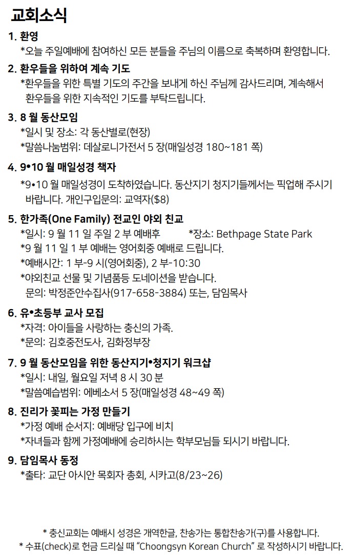 8월 21일 주일예배 주보 Aug 21, 2022 0 Comment Post By:CSKC Share: Prev Next You Might Also Like 18 Oct 2025 0 10월 19일 주일예배 주보 11 Oct 2025 0 10월 12일 주일예배 주보 5 Oct 2025 0 한마음 10월 기도제목