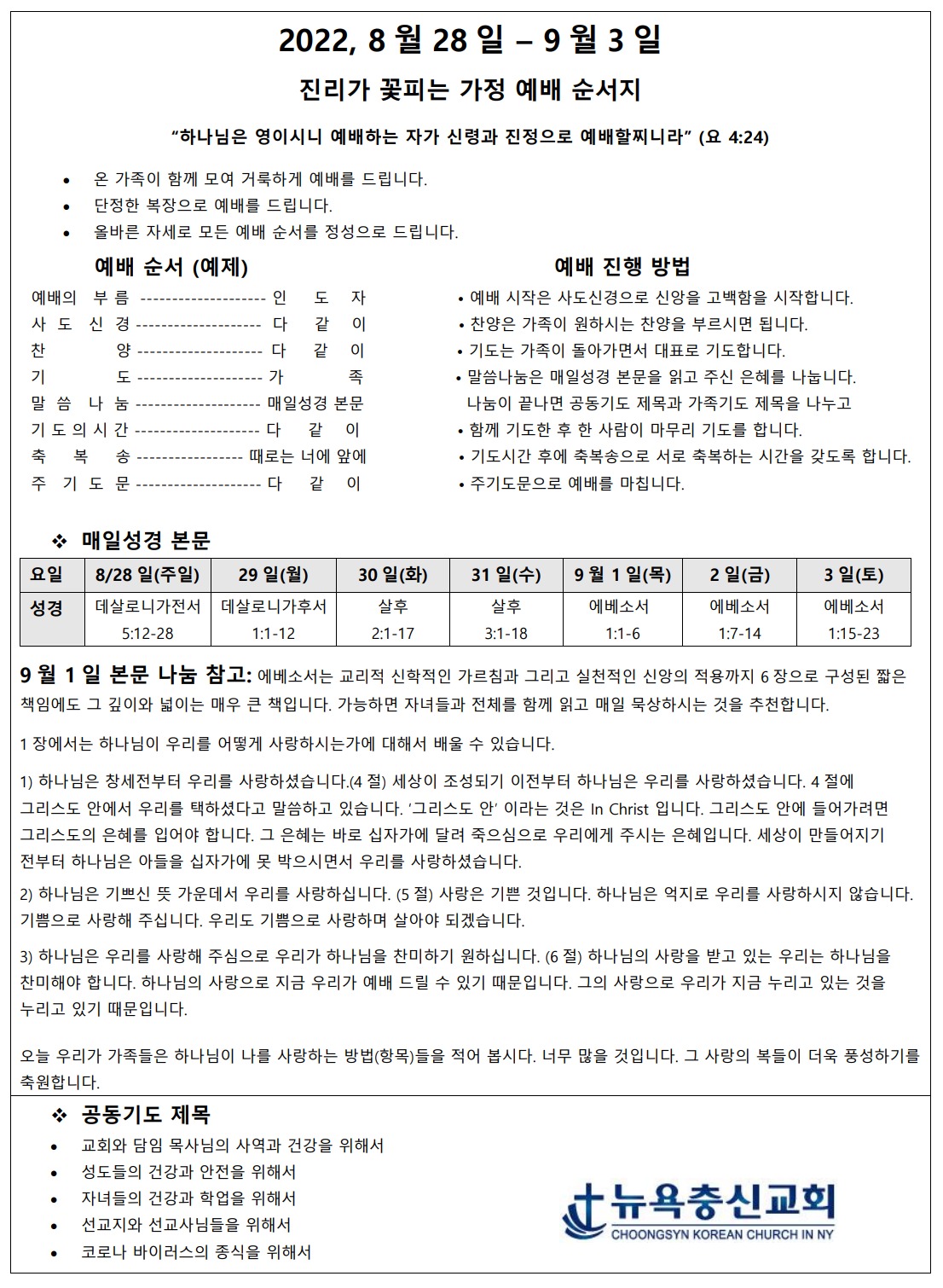 8월 4주차 가정예배지 Aug 28, 2022 0 Comment Post By:CSKC Share: Prev Next You Might Also Like 18 Oct 2025 0 10월 19일 주일예배 주보 11 Oct 2025 0 10월 12일 주일예배 주보 5 Oct 2025 0 한마음 10월 기도제목