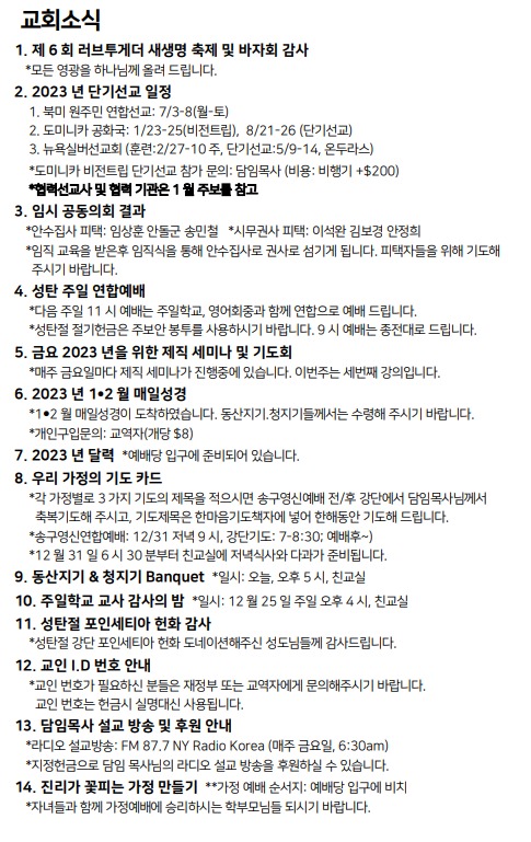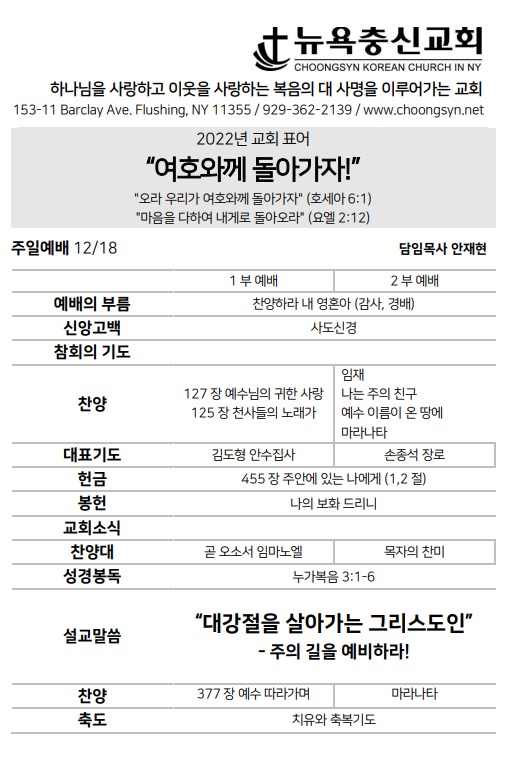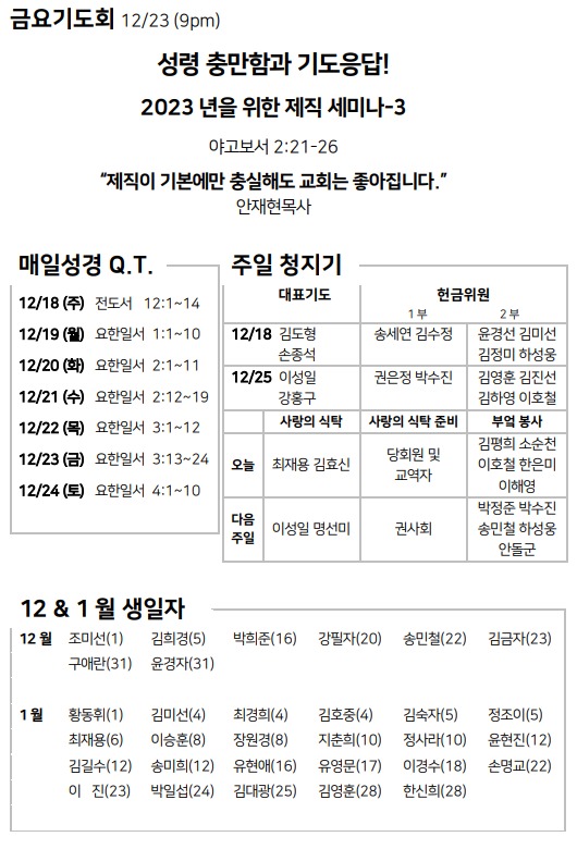 12월 18일 주일예배 주보 Dec 17, 2022 0 Comment Post By:CSKC Share: Prev Next You Might Also Like 18 Oct 2025 0 10월 19일 주일예배 주보 11 Oct 2025 0 10월 12일 주일예배 주보 5 Oct 2025 0 한마음 10월 기도제목