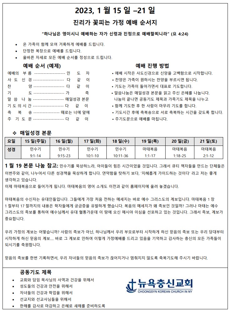 1월 3주차 가정예배지 Jan 14, 2023 0 Comment Post By:CSKC Share: Prev Next You Might Also Like 25 Oct 2025 0 10월 26일 주일예배 주보 18 Oct 2025 0 10월 19일 주일예배 주보 11 Oct 2025 0 10월 12일 주일예배 주보