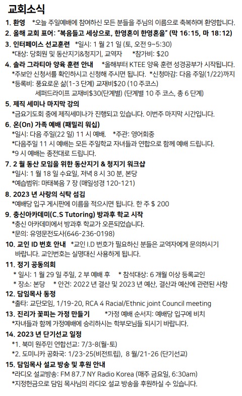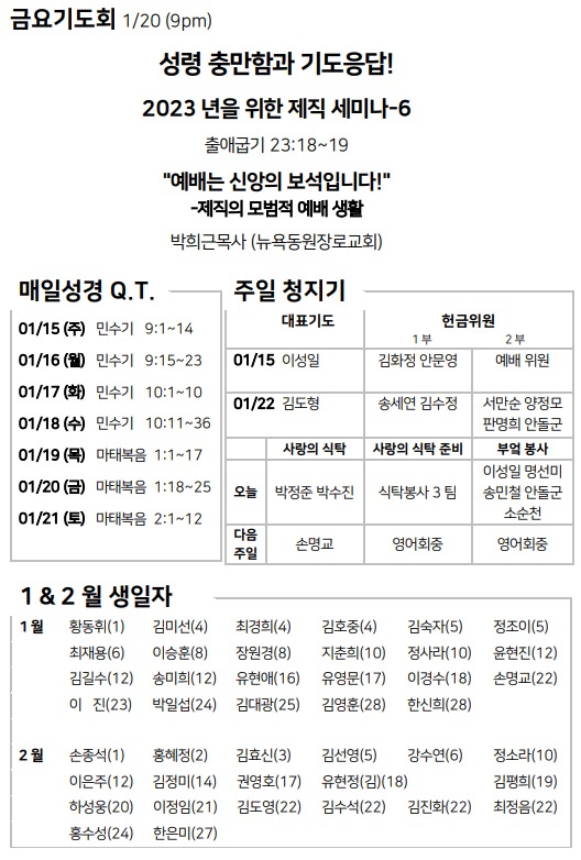 1월 15일 주일예배 주보 Jan 14, 2023 0 Comment Post By:CSKC Share: Prev Next You Might Also Like 25 Oct 2025 0 10월 26일 주일예배 주보 18 Oct 2025 0 10월 19일 주일예배 주보 11 Oct 2025 0 10월 12일 주일예배 주보
