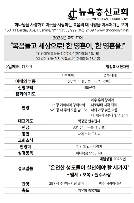 뉴욕충신교회 > 주보 > 1월 29일 주일예배 주보