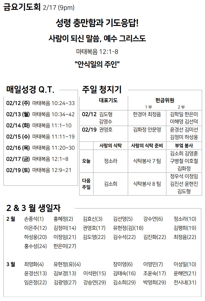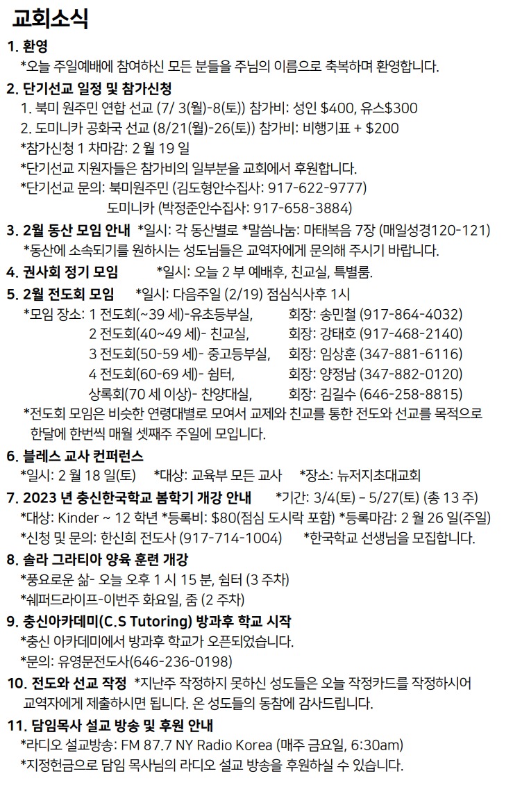 2월 12일 주일예배 주보 Feb 12, 2023 0 Comment Post By:CSKC Share: Prev Next You Might Also Like 25 Oct 2025 0 10월 26일 주일예배 주보 18 Oct 2025 0 10월 19일 주일예배 주보 11 Oct 2025 0 10월 12일 주일예배 주보