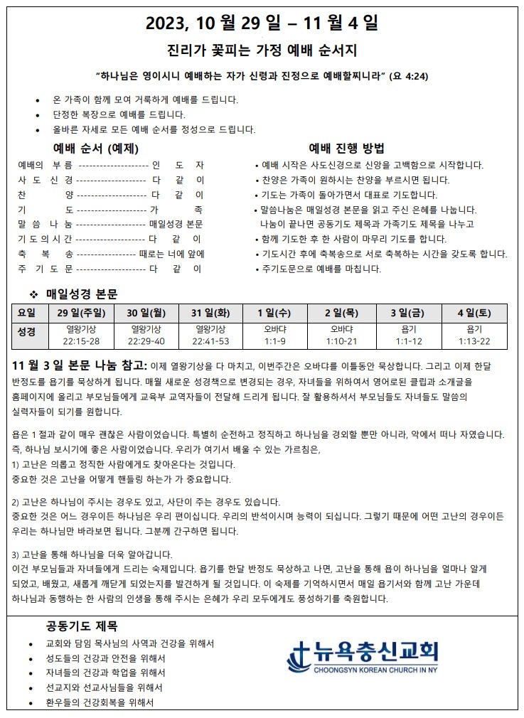 10월 5주차 가정예배지 Oct 28, 2023 0 Comment Post By:CSKC Share: Prev Next You Might Also Like 18 Oct 2025 0 10월 19일 주일예배 주보 11 Oct 2025 0 10월 12일 주일예배 주보 5 Oct 2025 0 한마음 10월 기도제목