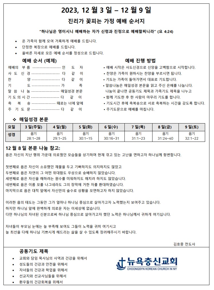 12월 1주차 가정예배지 Dec 2, 2023 0 Comment Post By:CSKC Share: Prev Next You Might Also Like 18 Oct 2025 0 10월 19일 주일예배 주보 11 Oct 2025 0 10월 12일 주일예배 주보 5 Oct 2025 0 한마음 10월 기도제목
