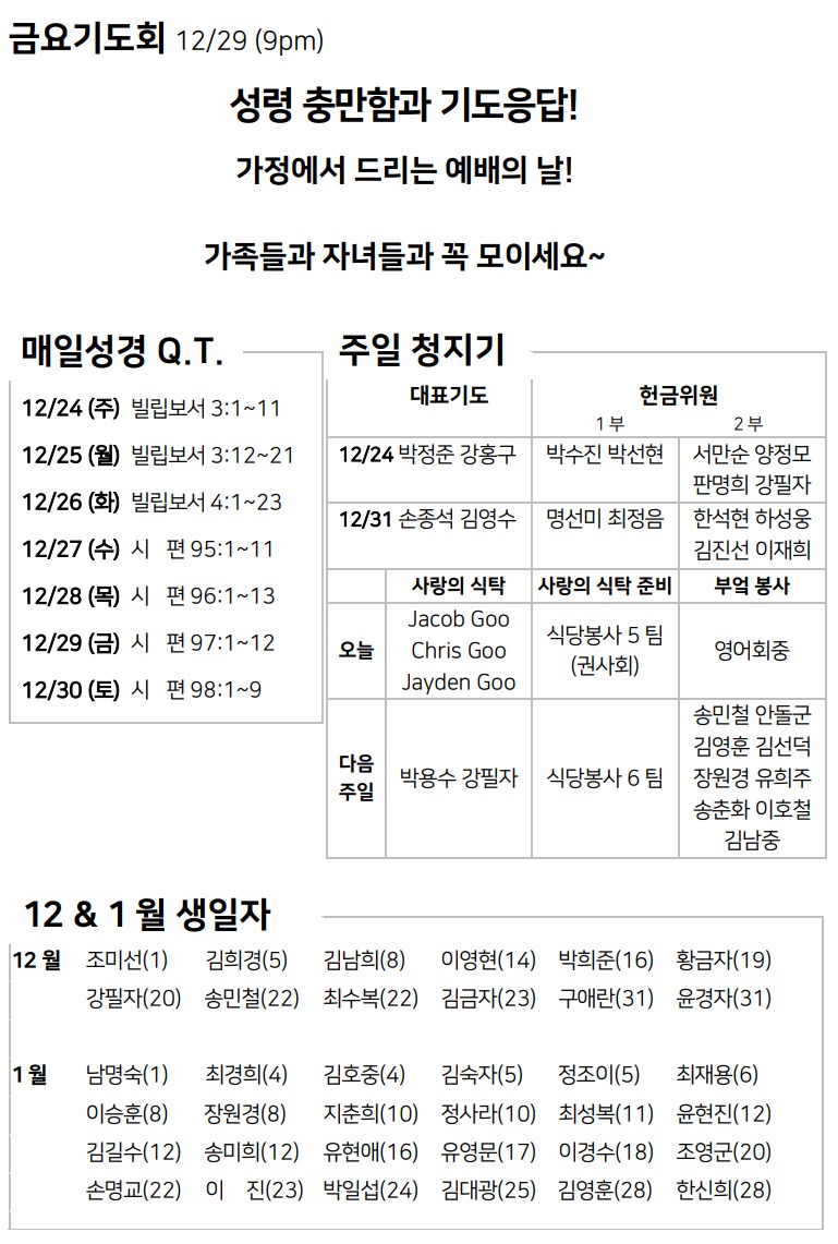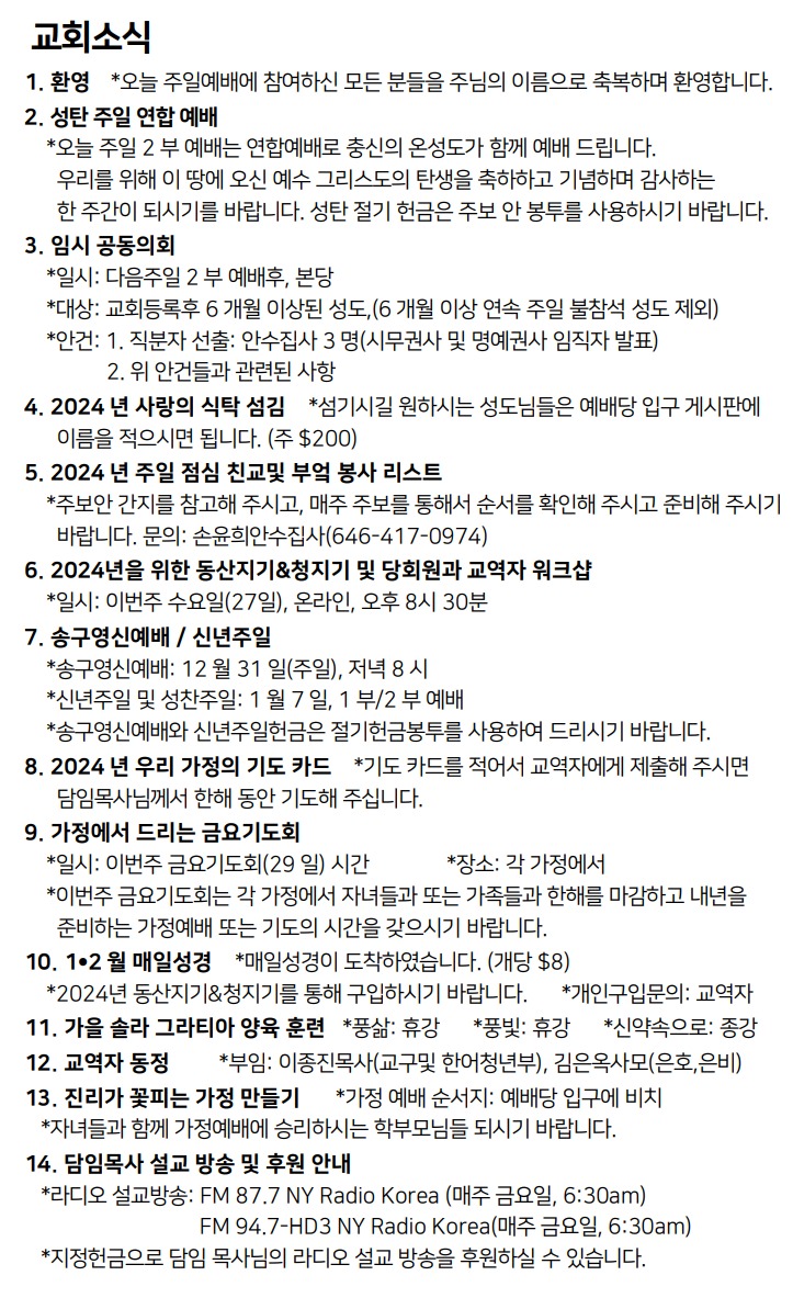 12월 24일 주일예배 주보 Dec 24, 2023 0 Comment Post By:CSKC Share: Prev Next You Might Also Like 18 Oct 2025 0 10월 19일 주일예배 주보 11 Oct 2025 0 10월 12일 주일예배 주보 5 Oct 2025 0 한마음 10월 기도제목