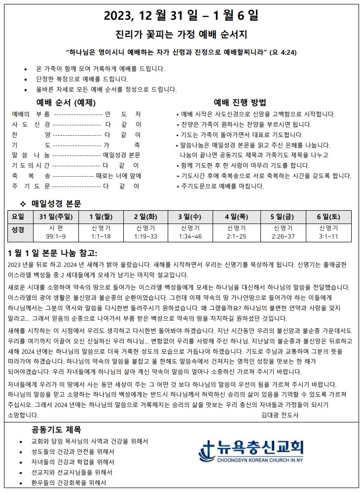 12월 5주차 가정예배지 Dec 31, 2023 0 Comment Post By:CSKC Share: Prev Next You Might Also Like 18 Oct 2025 0 10월 19일 주일예배 주보 11 Oct 2025 0 10월 12일 주일예배 주보 5 Oct 2025 0 한마음 10월 기도제목