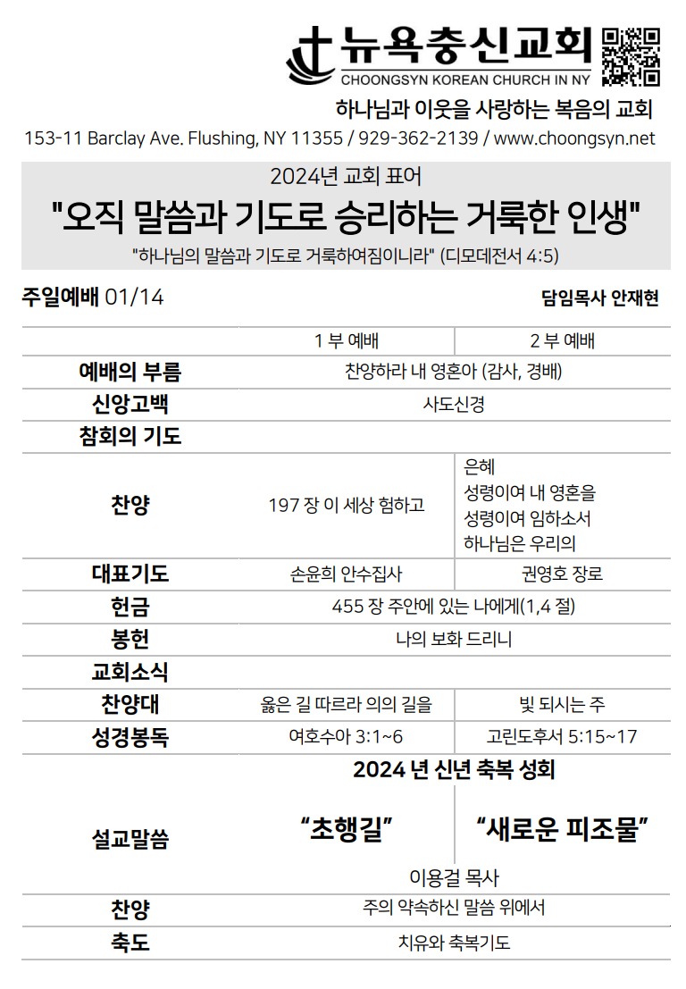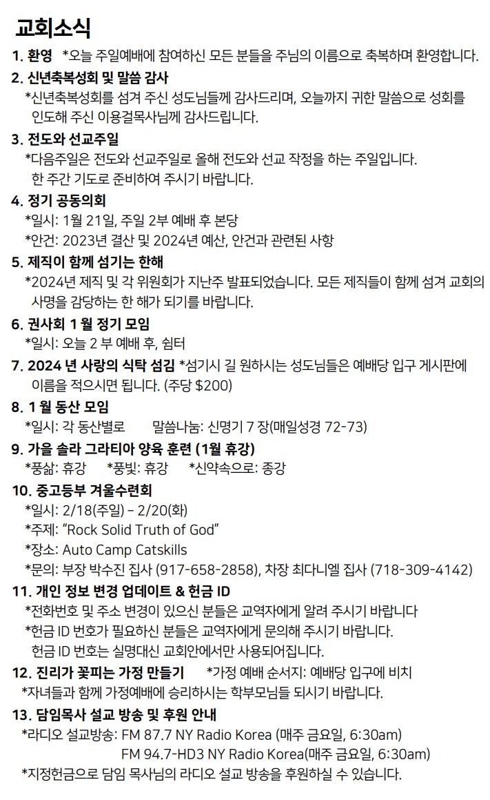 1월 14일 주일예배 주보 Jan 13, 2024 0 Comment Post By:CSKC Share: Prev Next You Might Also Like 18 Oct 2025 0 10월 19일 주일예배 주보 11 Oct 2025 0 10월 12일 주일예배 주보 5 Oct 2025 0 한마음 10월 기도제목
