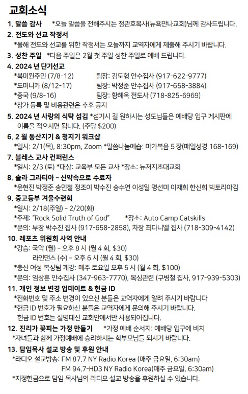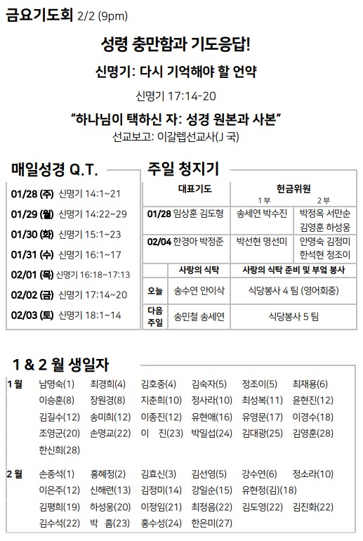 1월 28일 주일예배 주보 Jan 27, 2024 0 Comment Post By:CSKC Share: Prev Next You Might Also Like 18 Oct 2025 0 10월 19일 주일예배 주보 11 Oct 2025 0 10월 12일 주일예배 주보 5 Oct 2025 0 한마음 10월 기도제목