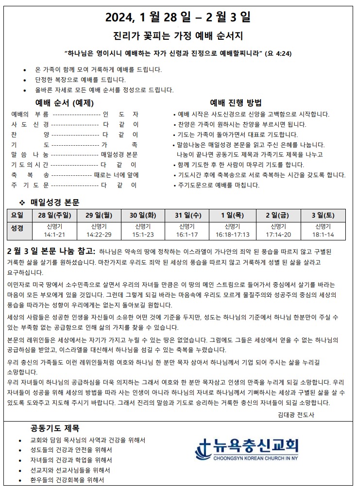 1월 4주차 가정예배지 Jan 27, 2024 0 Comment Post By:CSKC Share: Prev Next You Might Also Like 18 Oct 2025 0 10월 19일 주일예배 주보 11 Oct 2025 0 10월 12일 주일예배 주보 5 Oct 2025 0 한마음 10월 기도제목