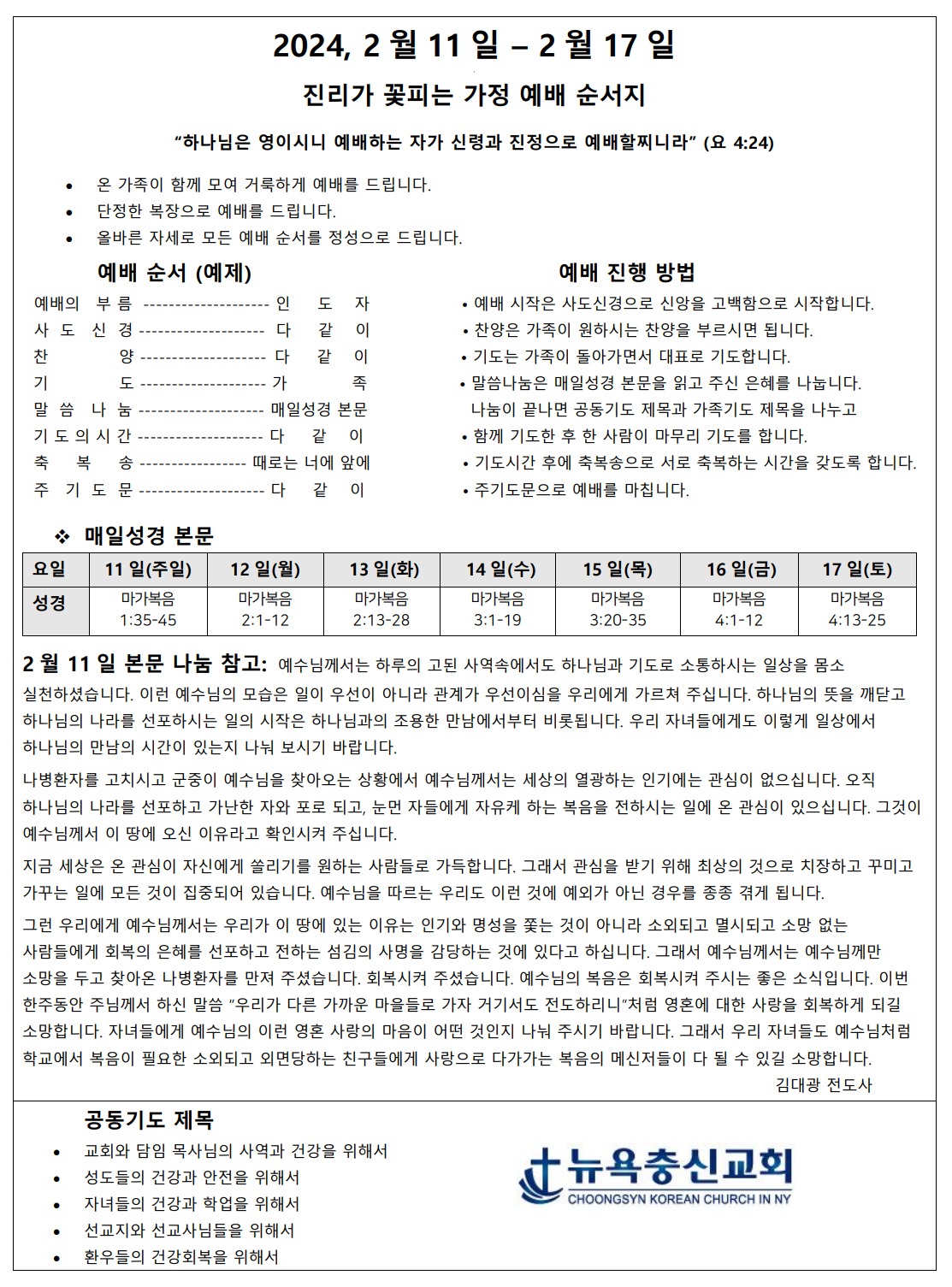 뉴욕충신교회 > 나눔 > 2월 2주차 가정예배지