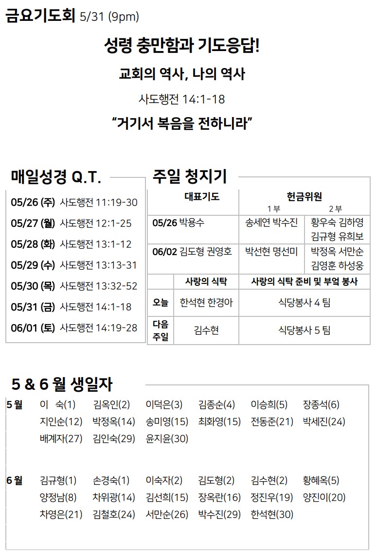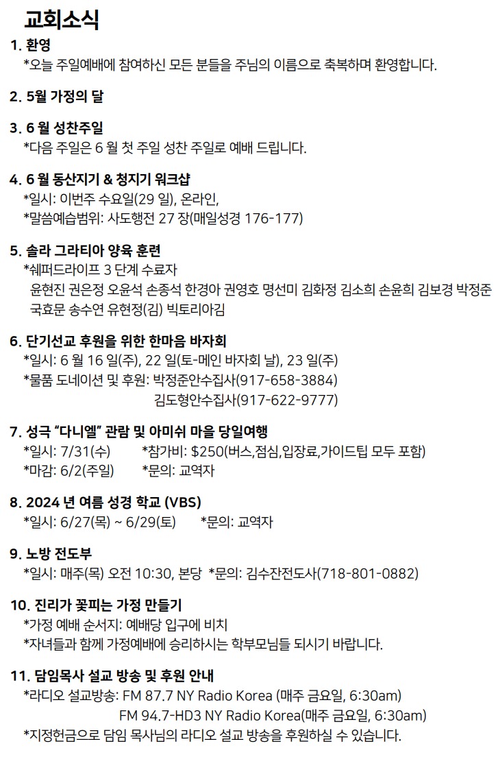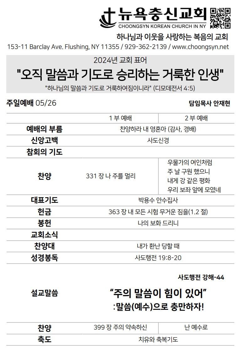 뉴욕충신교회 > 주보 > 5월 26일 주일예배 주보