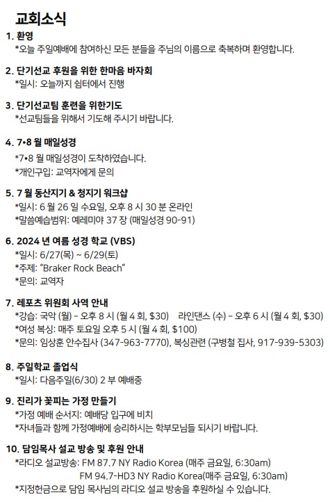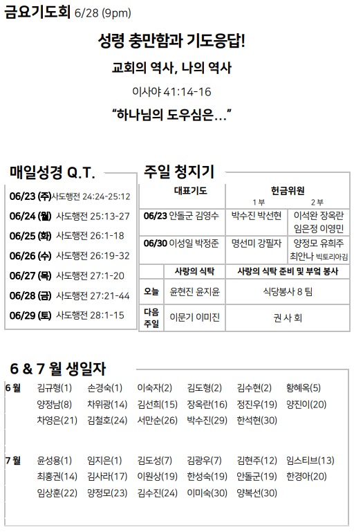 6월 23일 주일예배 주보 Jun 22, 2024 0 Comment Post By:CSKC Share: Prev Next You Might Also Like 18 Oct 2025 0 10월 19일 주일예배 주보 11 Oct 2025 0 10월 12일 주일예배 주보 5 Oct 2025 0 한마음 10월 기도제목