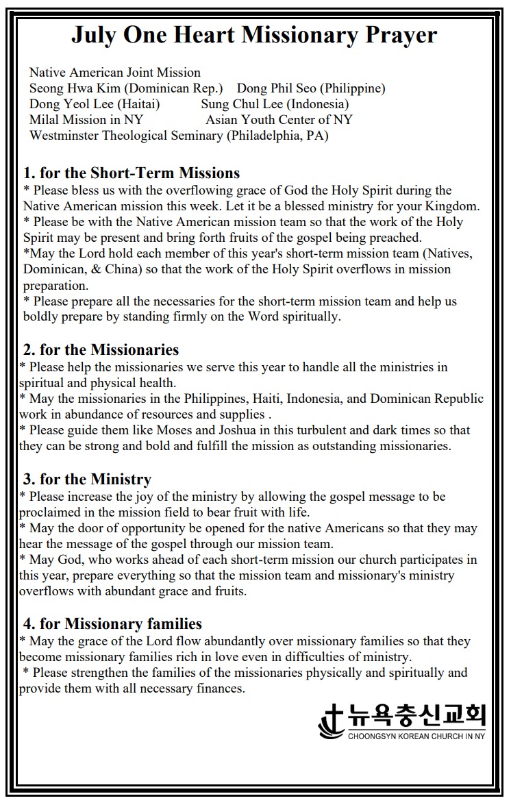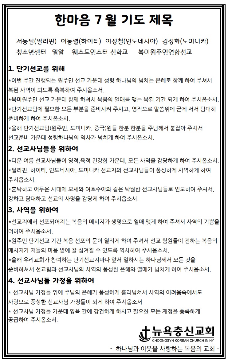 한마음 7월 기도제목 Jul 6, 2024 0 Comment Post By:CSKC Share: Prev Next You Might Also Like 18 Oct 2025 0 10월 19일 주일예배 주보 11 Oct 2025 0 10월 12일 주일예배 주보 5 Oct 2025 0 한마음 10월 기도제목