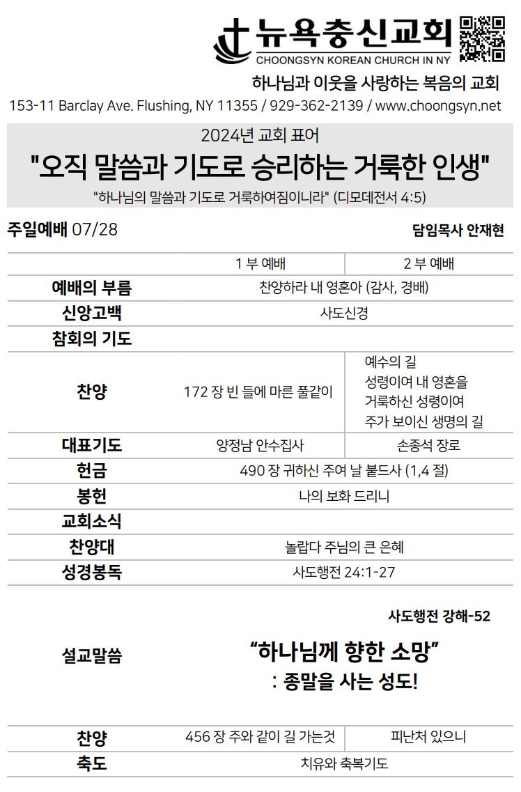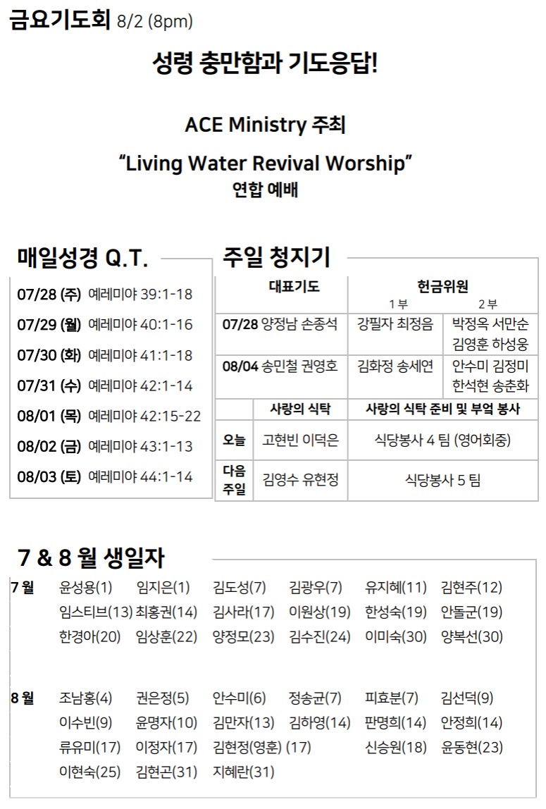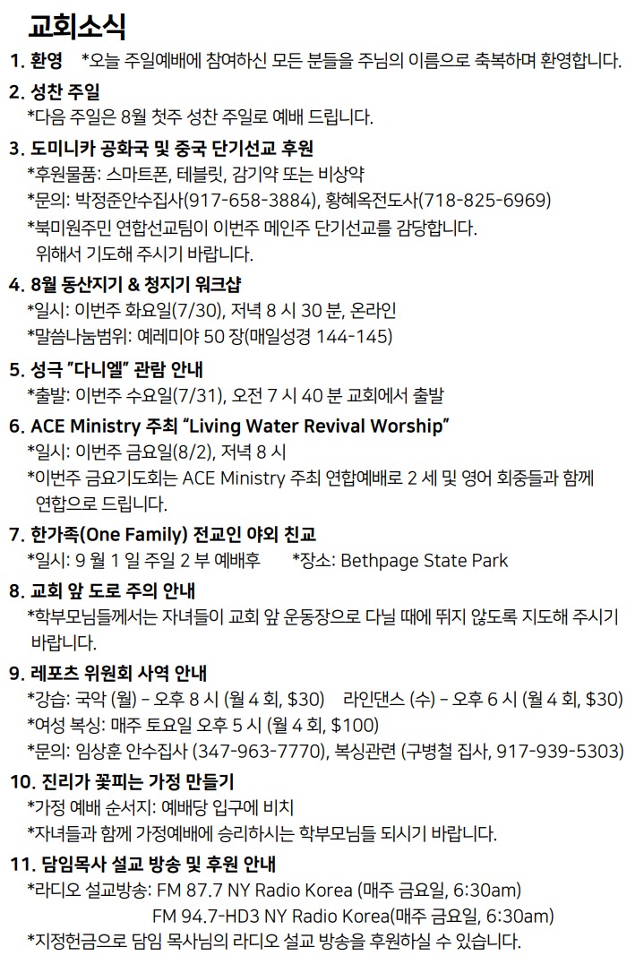 7월 28일 주일예배 주보 Jul 27, 2024 0 Comment Post By:CSKC Share: Prev Next You Might Also Like 18 Oct 2025 0 10월 19일 주일예배 주보 11 Oct 2025 0 10월 12일 주일예배 주보 5 Oct 2025 0 한마음 10월 기도제목