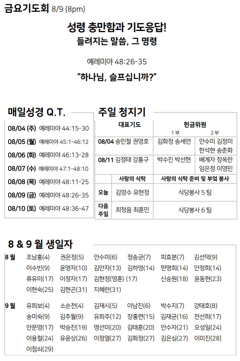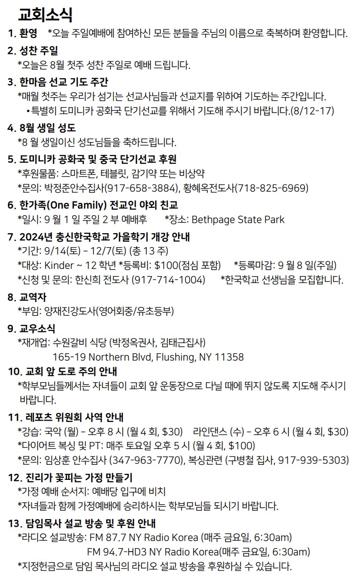 8월 4일 주일예배 주보 Aug 3, 2024 0 Comment Post By:CSKC Share: Prev Next You Might Also Like 18 Oct 2025 0 10월 19일 주일예배 주보 11 Oct 2025 0 10월 12일 주일예배 주보 5 Oct 2025 0 한마음 10월 기도제목