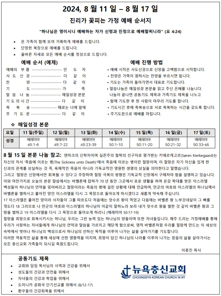 8월 2주차 가정예배지 Aug 10, 2024 0 Comment Post By:CSKC Share: Prev Next You Might Also Like 18 Oct 2025 0 10월 19일 주일예배 주보 11 Oct 2025 0 10월 12일 주일예배 주보 5 Oct 2025 0 한마음 10월 기도제목
