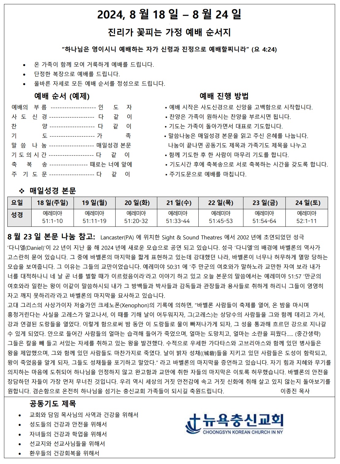 8월 3주차 가정예배지 Aug 17, 2024 0 Comment Post By:CSKC Share: Prev Next You Might Also Like 18 Oct 2025 0 10월 19일 주일예배 주보 11 Oct 2025 0 10월 12일 주일예배 주보 5 Oct 2025 0 한마음 10월 기도제목